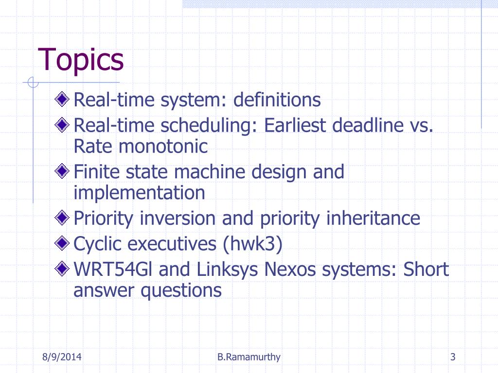 Topics • Real-time system: definitions • Real-time scheduling: Earliest deadline vs. Rate monotonic • Finite state machine design and implementation • Priority inversion and priority inheritance • Cyclic executives (hwk3) • WRT54Gl and Linksys Nexos systems: Short answer questions B.Ramamurthy