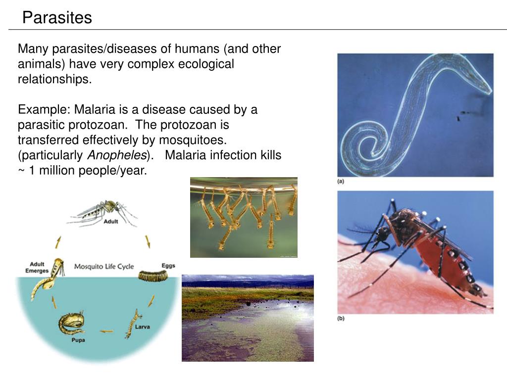 Parasites Many parasites/diseases of humans (and other animals) have very complex ecological relationships. Example: Malaria is a disease caused by a parasitic protozoan. The protozoan is transferred effectively by mosquitoes. (particularly Anopheles). Malaria infection kills ~ 1 million people/year.
