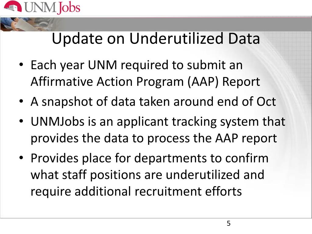Update on Underutilized Data • Each year UNM required to submit an Affirmative Action Program (AAP) Report • A snapshot of data taken around end of Oct • UNMJobs is an applicant tracking system that provides the data to process the AAP report • Provides place for departments to confirm what staff positions are underutilized and require additional recruitment efforts