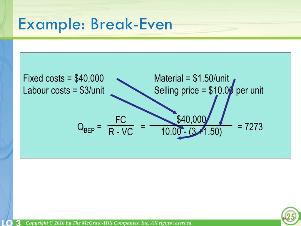 QBEP = = = 7273 $40,000 10.00 - (3 +1.50) FC R - VC Example: Break-Even Fixed costs = $40,000 Material = $1.50/unit Labour costs = $3/unit Selling price = $10.00 per unit