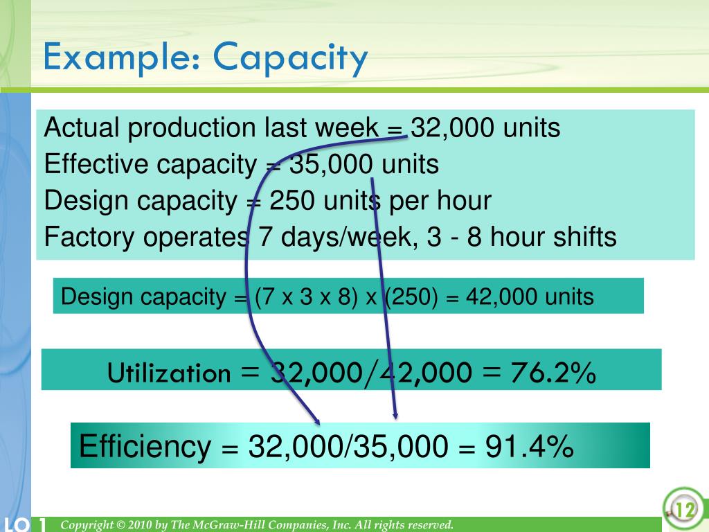 What is the design capacity for one week? Calculate the efficiency and utilization rates. Example: Capacity Actual production last week = 32,000 units Effective capacity = 35,000 units Design capacity = 250 units per hour Factory operates 7 days/week, 3 - 8 hour shifts Design capacity = (7 x 3 x 8) x (250) = 42,000 units