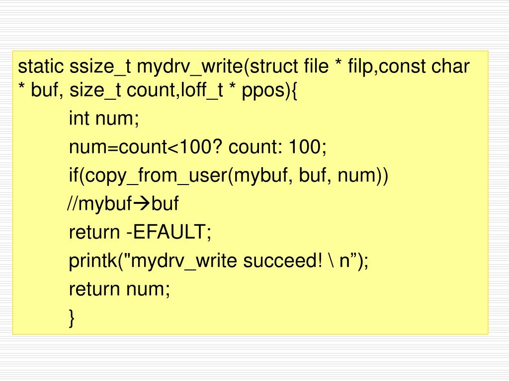 static ssize_t mydrv_write(struct file * filp,const char * buf, size_t count,loff_t * ppos){ int num; num=count<100? count: 100; if(copy_from_user(mybuf, buf, num)) //mybufbuf return -EFAULT; printk("mydrv_write succeed! \ n”); return num; } 10.3 驱动程序编写实例:具体实现