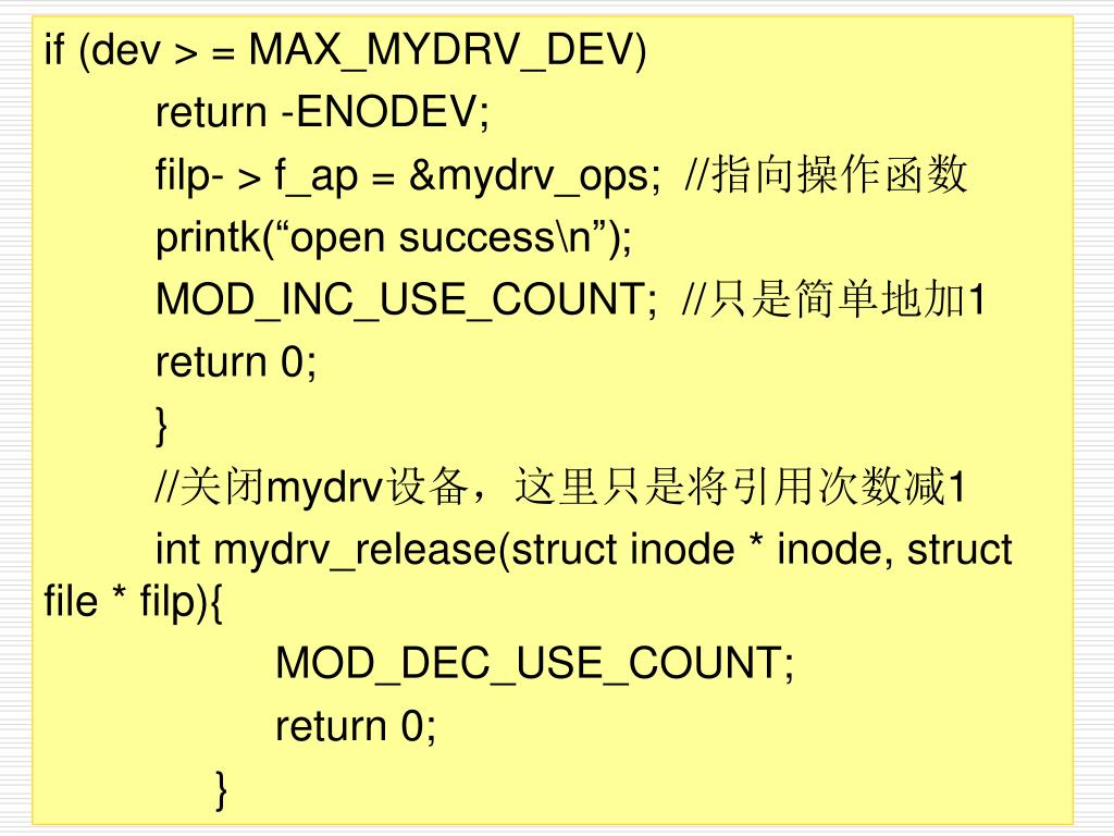 10.3 驱动程序编写实例:具体实现 //第二步:向系统注册该设备 // module的安装,采用两种方式进行了设备的注册 int init_module(void) { int result; printk(“initing...\ n”); result = devfs_register_chrdev(mydrv_major, “mydrv”,&mydrv_ops);