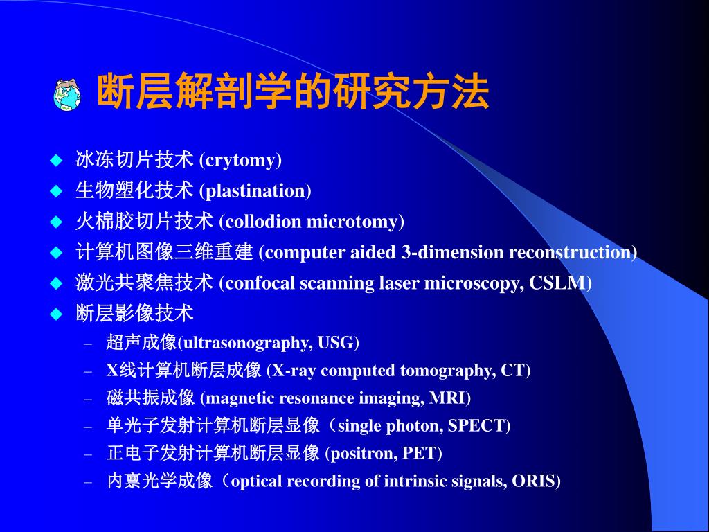 断层解剖学的研究方法 • 冰冻切片技术 (crytomy) • 生物塑化技术 (plastination) • 火棉胶切片技术 (collodion microtomy) • 计算机图像三维重建 (computer aided 3-dimension reconstruction) • 激光共聚焦技术 (confocal scanning laser microscopy, CSLM) • 断层影像技术 • 超声成像(ultrasonography, USG) • X线计算机断层成像 (X-ray computed tomography, CT) • 磁共振成像 (magnetic resonance imaging, MRI) • 单光子发射计算机断层显像(single photon, SPECT) • 正电子发射计算机断层显像 (positron, PET) • 内禀光学成像(optical recording of intrinsic signals, ORIS)