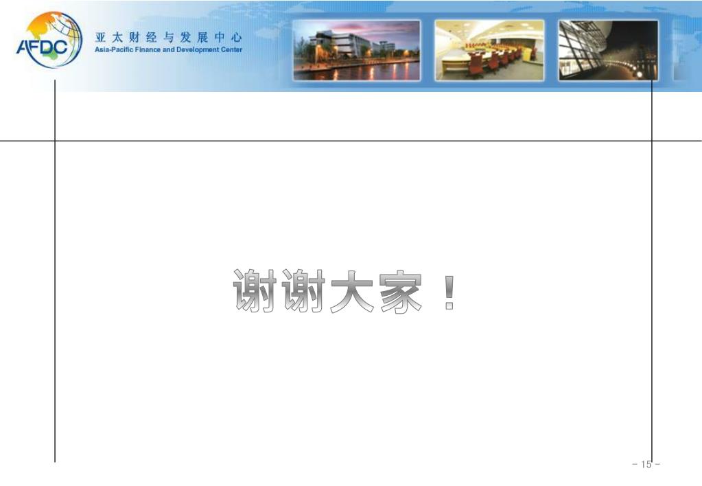 关于AFDC(亚太财经与发展中心) • 亚太财经与发展中心,是财政部直属单位。 • 中心的前身——APEC金融与发展项目(APEC Finance and Development Program,AFDP),是我国于2001年在APEC财长会机制下发起设立的APEC倡议活动,旨在通过举办培训、组织论坛和开展研究等多种形式的活动,促进APEC地区各经济体在金融和发展领域的机构能力建设。 • 2004年11月,在智利召开的APEC领导人非正式会议上,国家主席胡锦涛宣布,中国将在成功运作AFDP的基础上,成立亚太财经与发展中心这一常设性机构,继续为加强亚太地区财金与发展领域的能力建设做出新的贡献。 • 机构职能:宏观政策研究、对外财经交流及机构建设与培训等三大领域,致力于亚太区域内财金与发展领域的能力建设。 • 中心在上海和北京设有办事机构。 • 中心网址:http://www.afdc.org.cn。