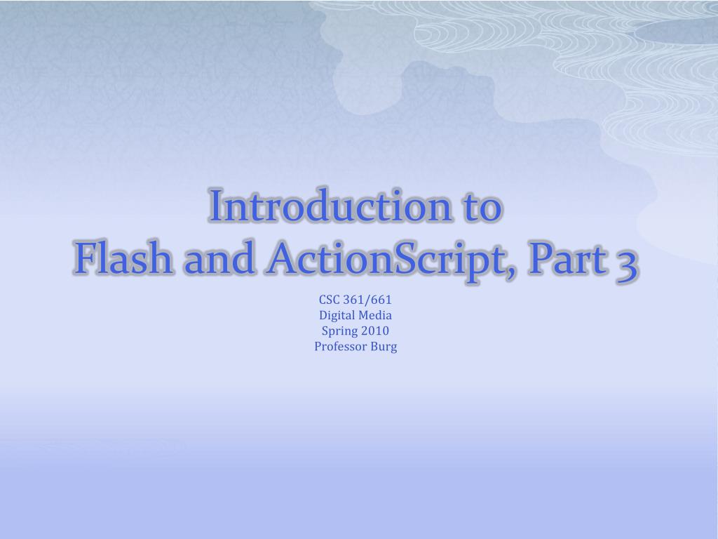 Introduction to Flash and ActionScript, Part 3 CSC 361/661 Digital Media Spring 2010 Professor Burg