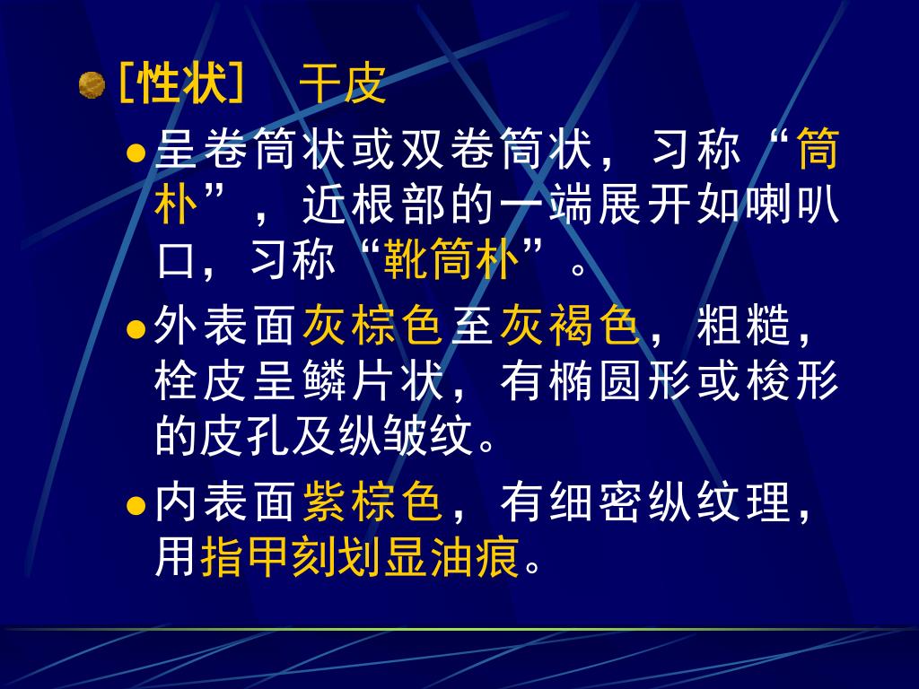 [性状]干皮 • 呈卷筒状或双卷筒状,习称“筒朴”,近根部的一端展开如喇叭口,习称“靴筒朴”。 • 外表面灰棕色至灰褐色,粗糙,栓皮呈鳞片状,有椭圆形或梭形的皮孔及纵皱纹。 • 内表面紫棕色,有细密纵纹理,用指甲刻划显油痕。