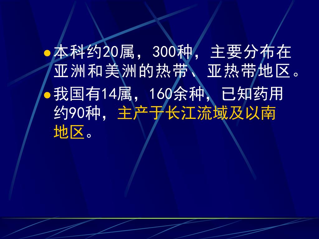 本科约20属,300种,主要分布在亚洲和美洲的热带、亚热带地区。本科约20属,300种,主要分布在亚洲和美洲的热带、亚热带地区。 • 我国有14属,160余种,已知药用约90种,主产于长江流域及以南地区。