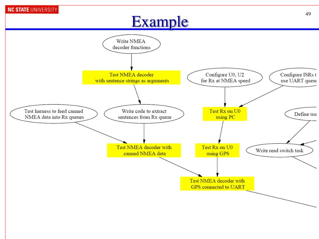 Example: Detailed Design for Chart Maker Any char. except *, \r or \n Append char to buf.Inc. counter • 3.2.1: ISRs: u0_rx_isr • Code to identify NMEA sentences to enqueue will implement the finite state machine FSM3.2.1 Start $Append char to buf. Talker +SentenceType *, \r or \n, orcounter==6 buf==$SDDBT, $VWVHW, or $YXXDR Enqueue all chars. from buf /r or /n SentenceBody Any char. except * Enqueue char * Enqueue char Checksum1 Any char. Save as checksum1 Checksum2 Any char. Save as checksum2