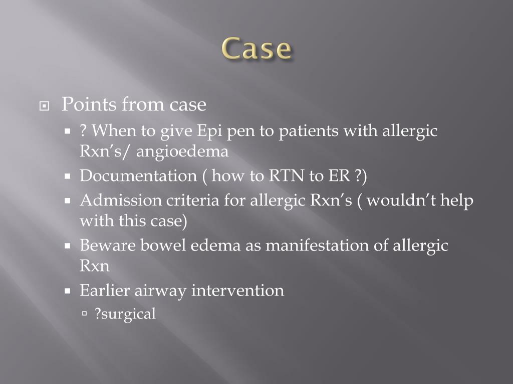 Case Presentation. Case. Points from case ? When to give Epi pen to patients with allergic Rxn’s / angioedema Documentation ( how to RTN to ER ?) Admission criteria for allergic Rxn’s ( wouldn’t help with this case) Beware bowel edema as manifestation of allergic Rxn