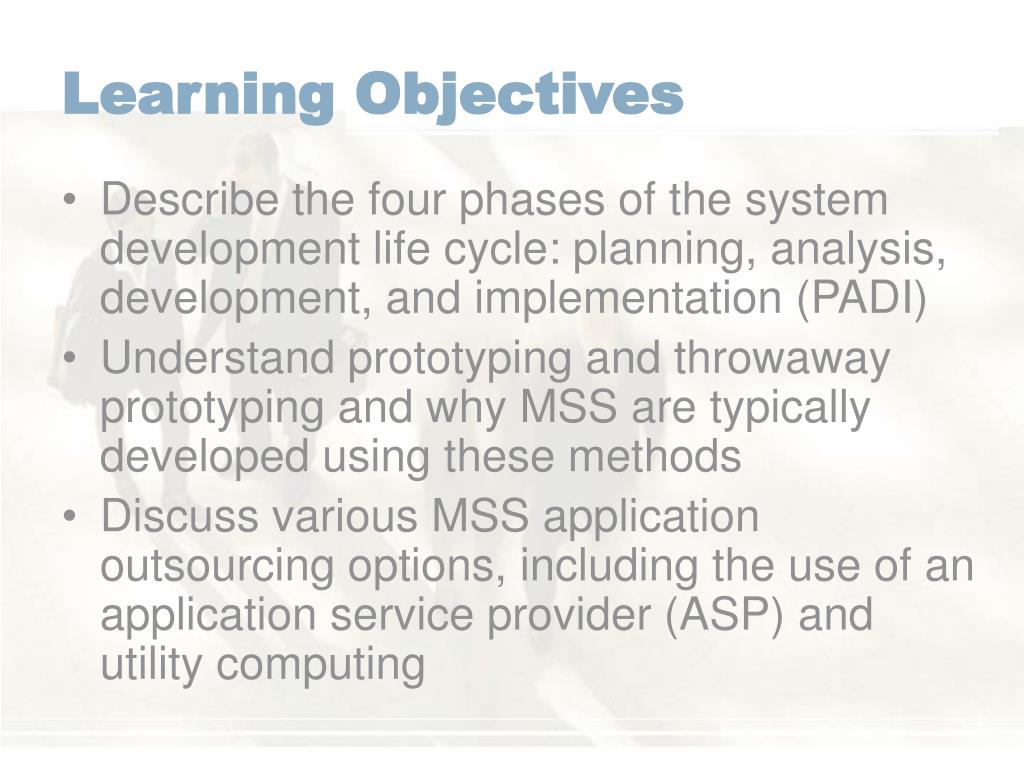 Learning Objectives • Describe the four phases of the system development life cycle: planning, analysis, development, and implementation (PADI) • Understand prototyping and throwaway prototyping and why MSS are typically developed using these methods • Discuss various MSS application outsourcing options, including the use of an application service provider (ASP) and utility computing