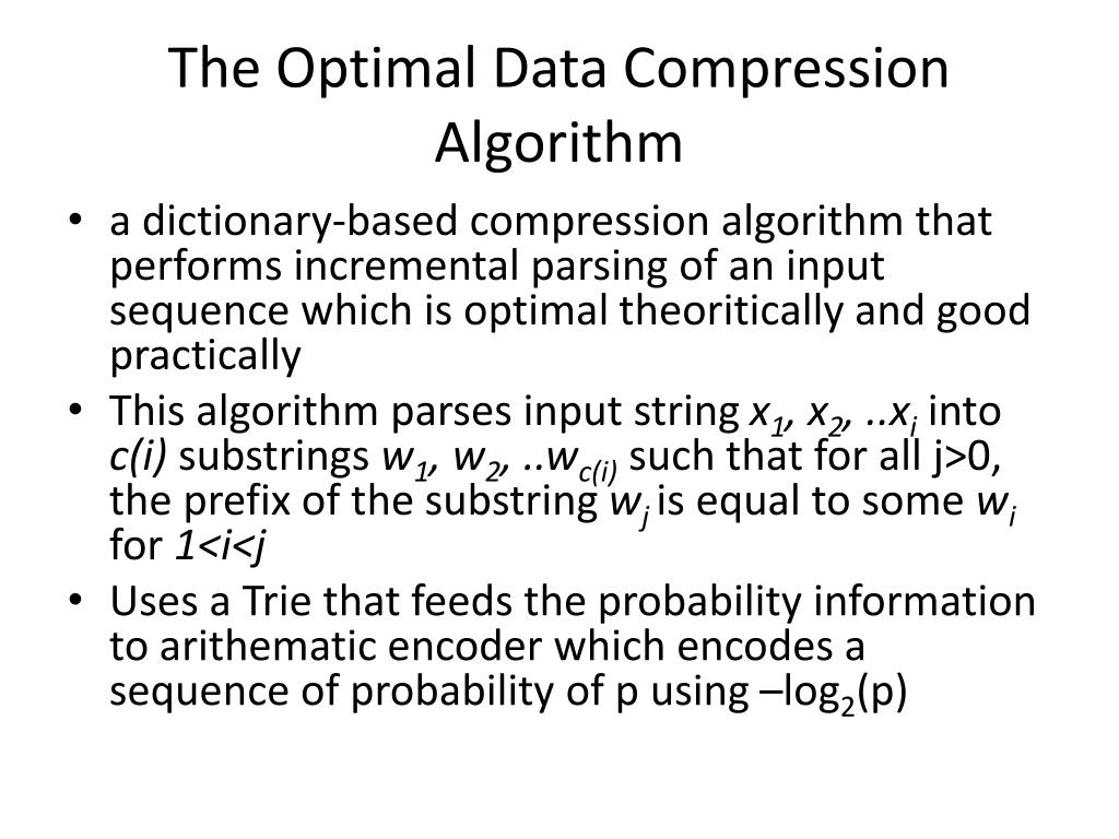 The Optimal Data Compression Algorithm • a dictionary-based compression algorithm that performs incremental parsing of an input sequence which is optimal theoritically and good practically • This algorithm parses input string x1, x2, ..xi into c(i) substrings w1, w2, ..wc(i) such that for all j>0, the prefix of the substring wjis equal to some wi for 1<i<j • Uses a Trie that feeds the probability information to arithematic encoder which encodes a sequence of probability of p using –log2(p)