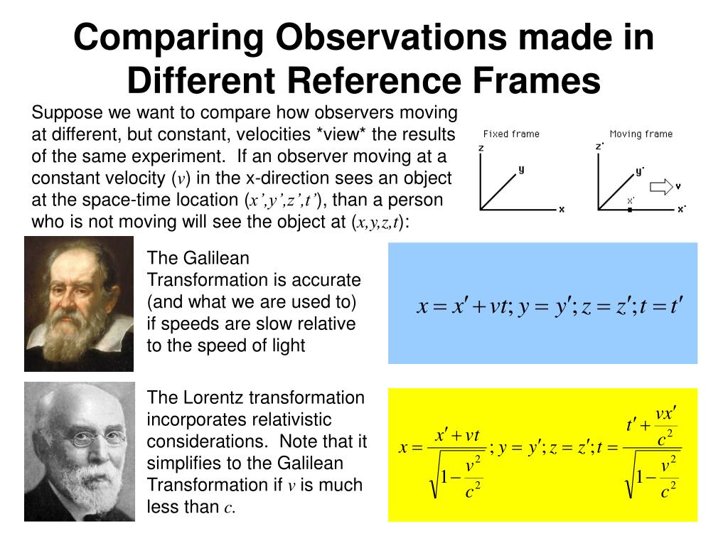 Comparing Observations made in Different Reference Frames Suppose we want to compare how observers moving at different, but constant, velocities *view* the results of the same experiment. If an observer moving at a constant velocity (v) in the x-direction sees an object at the space-time location (x’,y’,z’,t’), than a person who is not moving will see the object at (x,y,z,t): The Galilean Transformation is accurate (and what we are used to) if speeds are slow relative to the speed of light The Lorentz transformation incorporates relativistic considerations. Note that it simplifies to the Galilean Transformation if v is much less than c.
