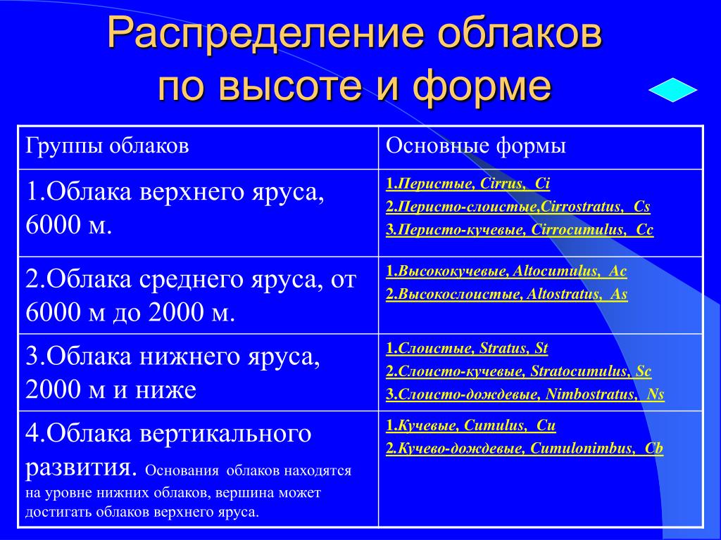 Основные виды облаков облака верхнего яруса 6000 м облака среднего яруса облака вертикального развития 2000 м облака нижнего яруса