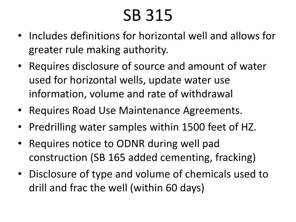 SB 315 • Includes definitions for horizontal well and allows for greater rule making authority. • Requires disclosure of source and amount of water used for horizontal wells, update water use information, volume and rate of withdrawal • Requires Road Use Maintenance Agreements. • Predrilling water samples within 1500 feet of HZ. • Requires notice to ODNR during well pad construction (SB 165 added cementing, fracking) • Disclosure of type and volume of chemicals used to drill and frac the well (within 60 days)