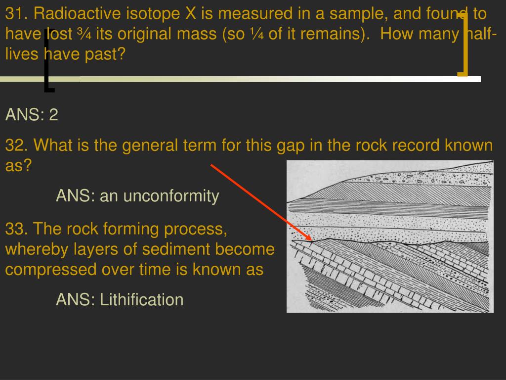 31. Radioactive isotope X is measured in a sample, and found to have lost ¾ its original mass (so ¼ of it remains). How many half-lives have past? ANS: 2 32. What is the general term for this gap in the rock record known as? ANS: an unconformity 33. The rock forming process, whereby layers of sediment become compressed over time is known as ANS: Lithification