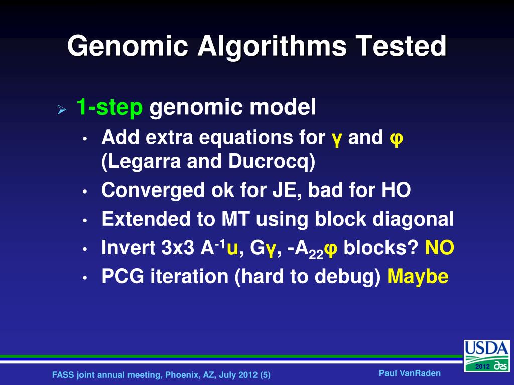 Genomic Algorithms Tested • 1-step genomic model • Add extra equations for γ and φ (Legarra and Ducrocq) • Converged ok for JE, bad for HO • Extended to MT using block diagonal • Invert 3x3 A-1u, Gγ, -A22φ blocks? NO • PCG iteration (hard to debug) Maybe