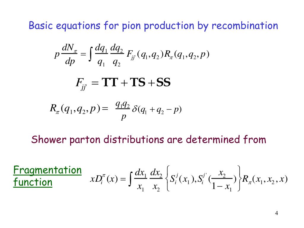 Fragmentation function Basic equations for pion production by recombination Shower parton distributions are determined from