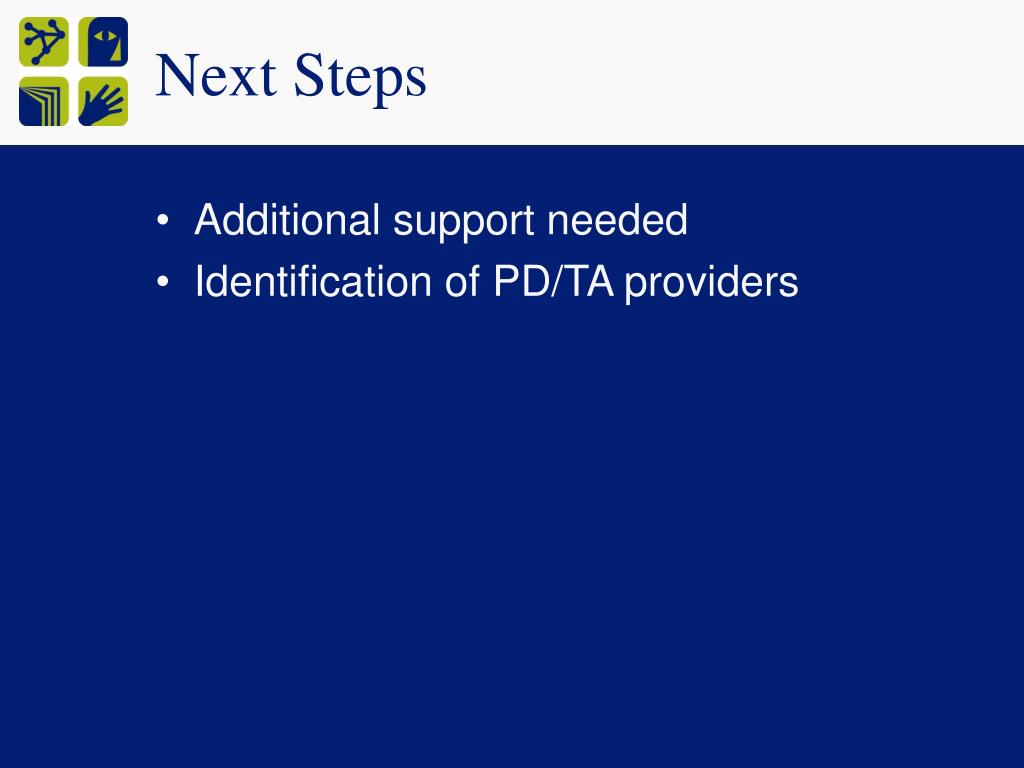 Next Steps • Additional support needed • Identification of PD/TA providers