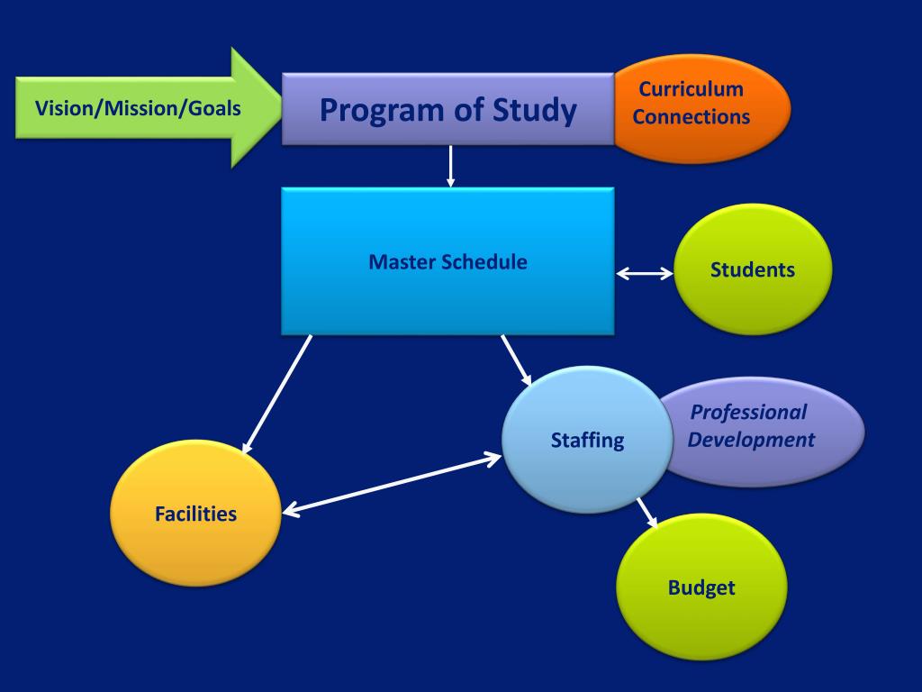 Vision/Mission/Goals Curriculum Connections Program of Study Master Schedule Students Staffing Professional Development Facilities Budget
