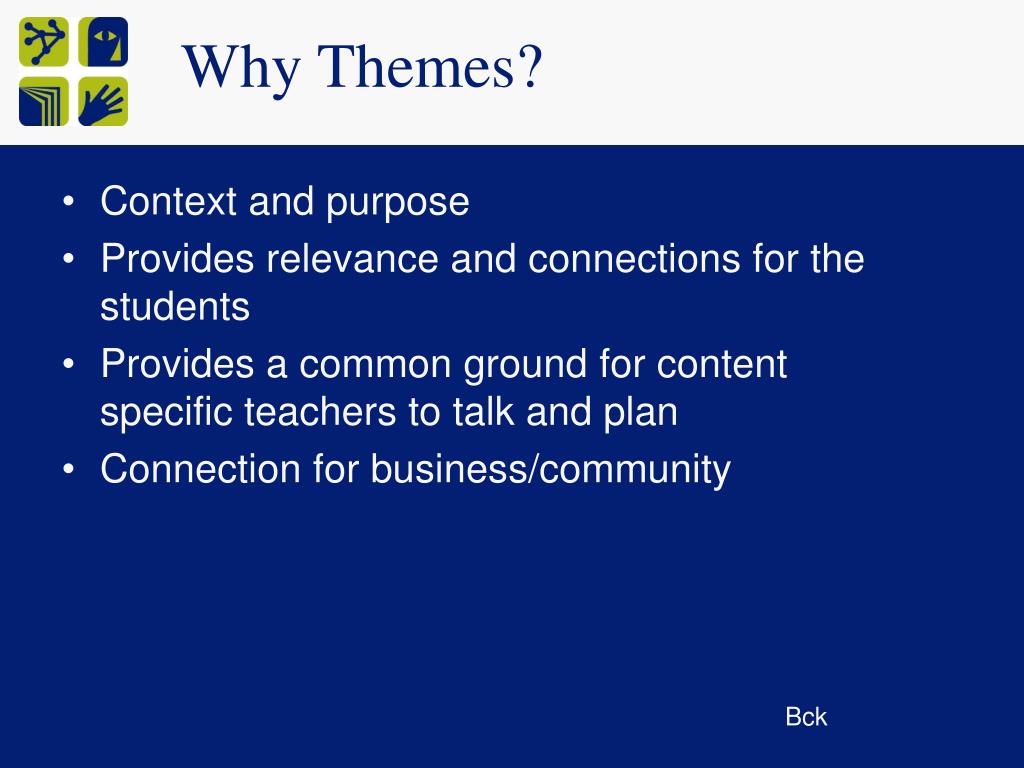 Why Themes? • Context and purpose • Provides relevance and connections for the students • Provides a common ground for content specific teachers to talk and plan • Connection for business/community Bck