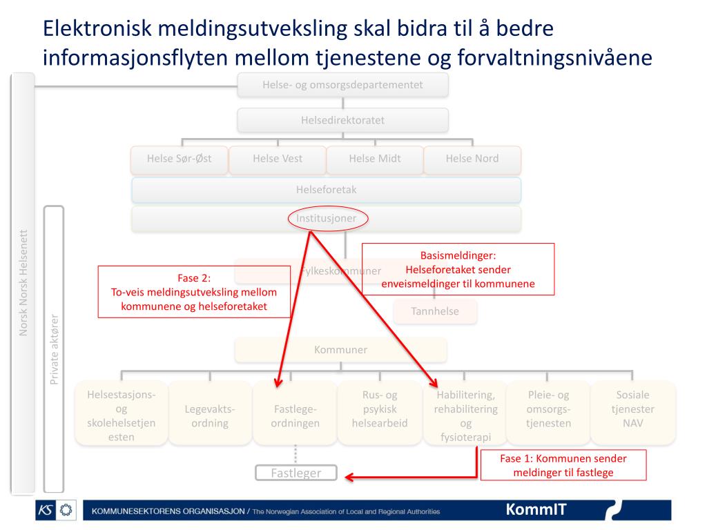 Helse- og omsorgsdepartementet Helsedirektoratet Elektronisk meldingsutveksling skal bidra til å bedre informasjonsflyten mellom tjenestene og forvaltningsnivåene Helse Sør-Øst Helse Vest Helse Midt Helse Nord Helseforetak Institusjoner Basismeldinger: Helseforetaket sender enveismeldinger til kommunene Fylkeskommuner Fase 2: To-veis meldingsutveksling mellom kommunene og helseforetaket Norsk Norsk Helsenett Tannhelse Kommuner Private aktører Helsestasjons- og skolehelsetjenesten Legevakts-ordning Fastlege-ordningen Rus- og psykisk helsearbeid Habilitering, rehabilitering og fysioterapi Pleie- og omsorgs-tjenesten Sosiale tjenester NAV Fase 1: Kommunen sender meldinger til fastlege Fastleger