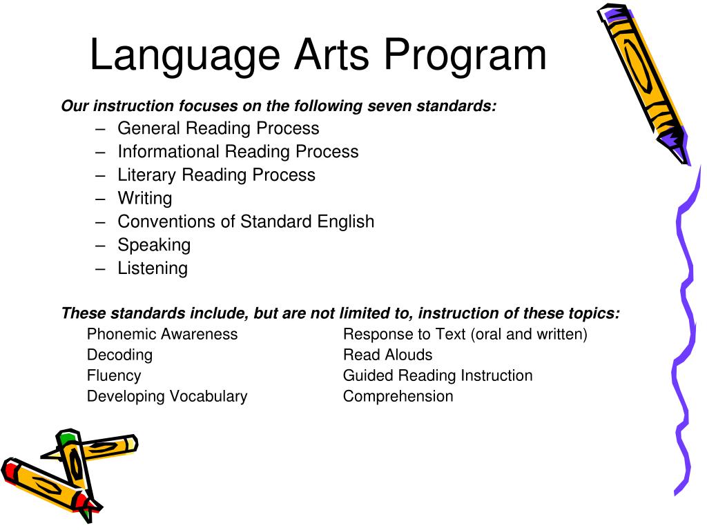 Our instruction focuses on the following seven standards: General Reading Process Informational Reading Process Literary Reading Process Writing Conventions of Standard English Speaking Listening These standards include, but are not limited to, instruction of these topics: Phonemic Awareness Response to Text (oral and written) Decoding Read Alouds Fluency Guided Reading Instruction Developing Vocabulary Comprehension Language Arts Program