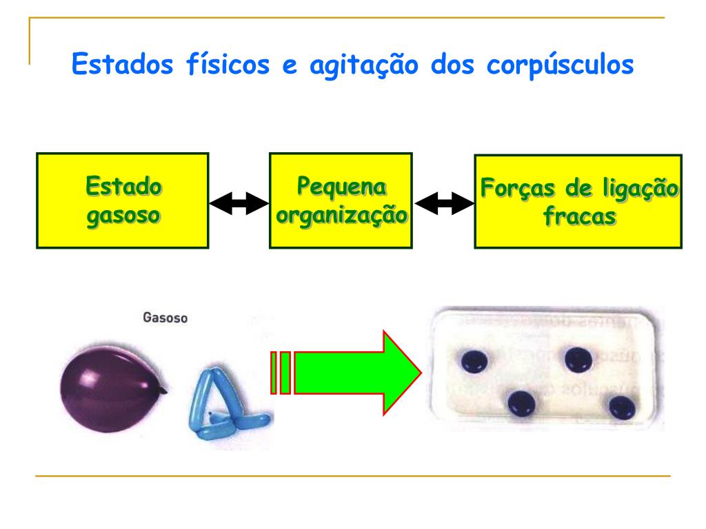 O estado gasoso é o estado físico em que há maior liberdade de movimento dos corpúsculos, menores forças de ligação e menor organização corpuscular. No balão os corpúsculos estão em constante movimento e chocam contra as suas paredes. A Pressão dos Gases