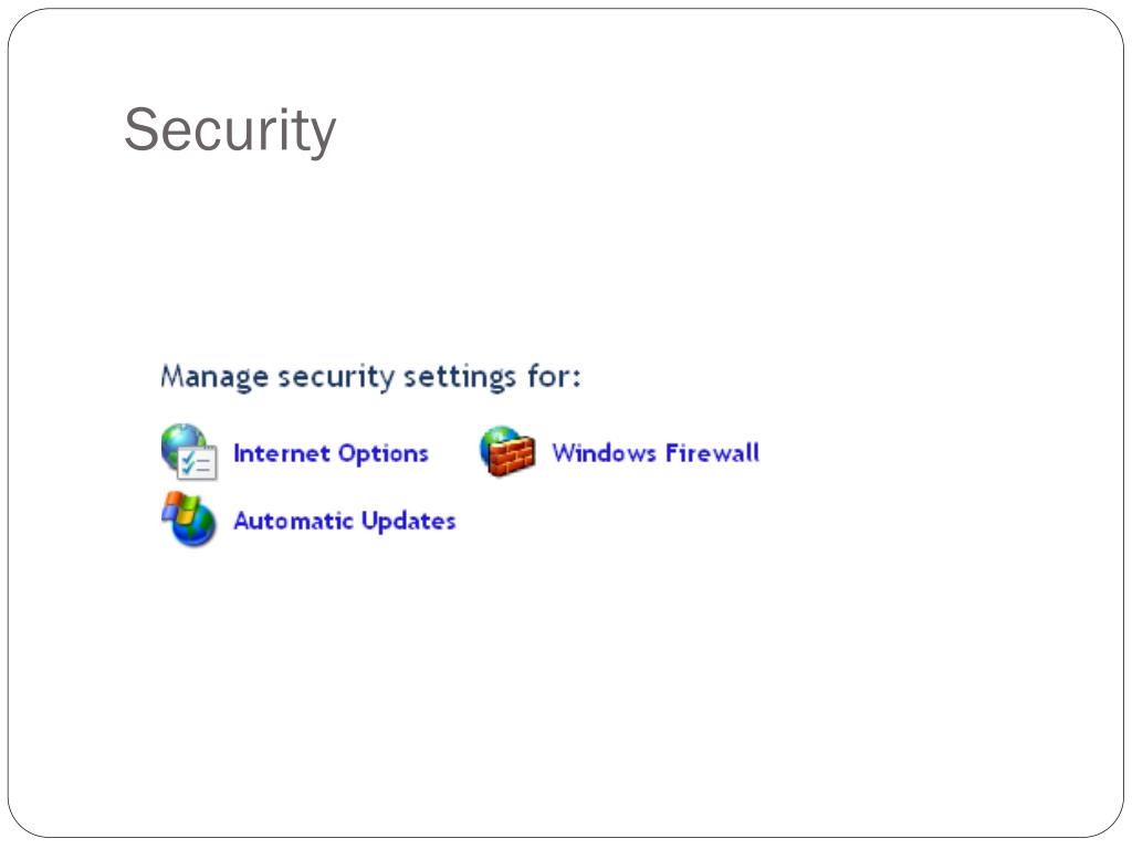 Firewall • Blocks other programs from running on your machine through the network • You can add exceptions for programs • Remote Desktop and Remote Assistance need to be added as exceptions