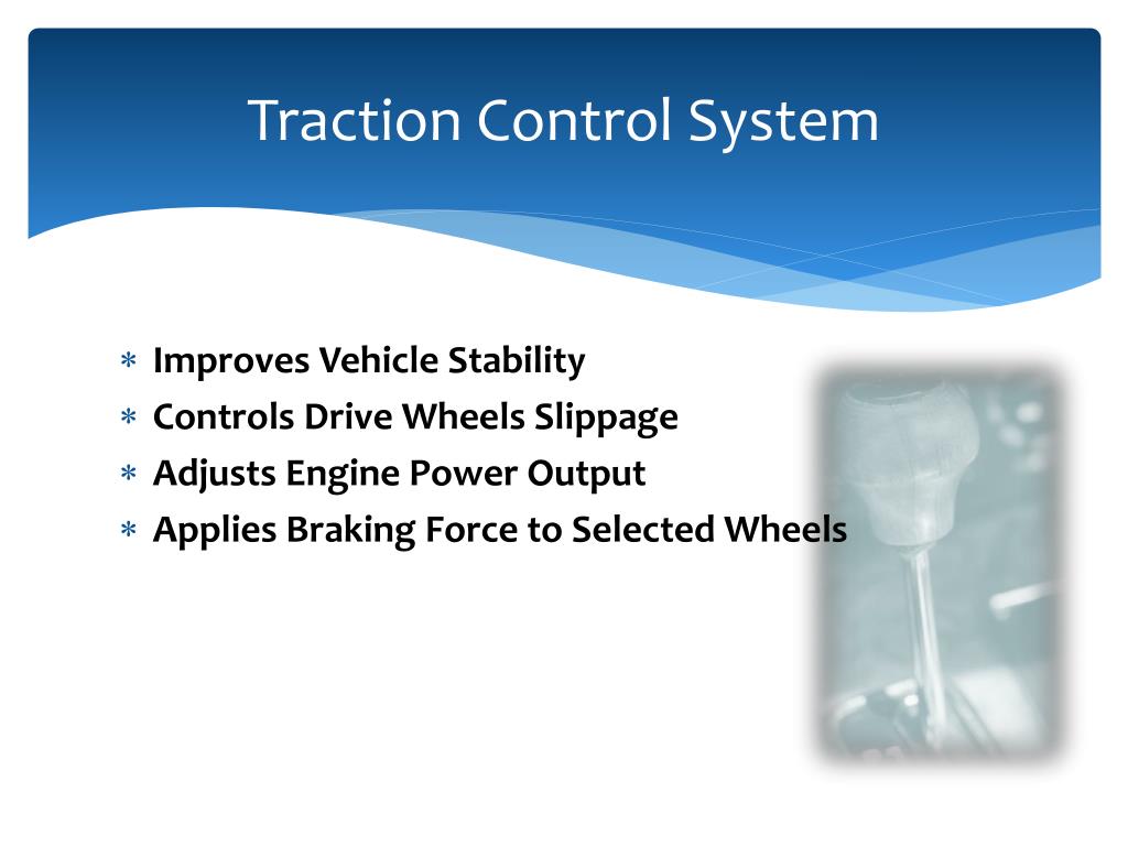 Traction Control System Improves Vehicle Stability Controls Drive Wheels Slippage Adjusts Engine Power Output Applies Braking Force to Selected Wheels