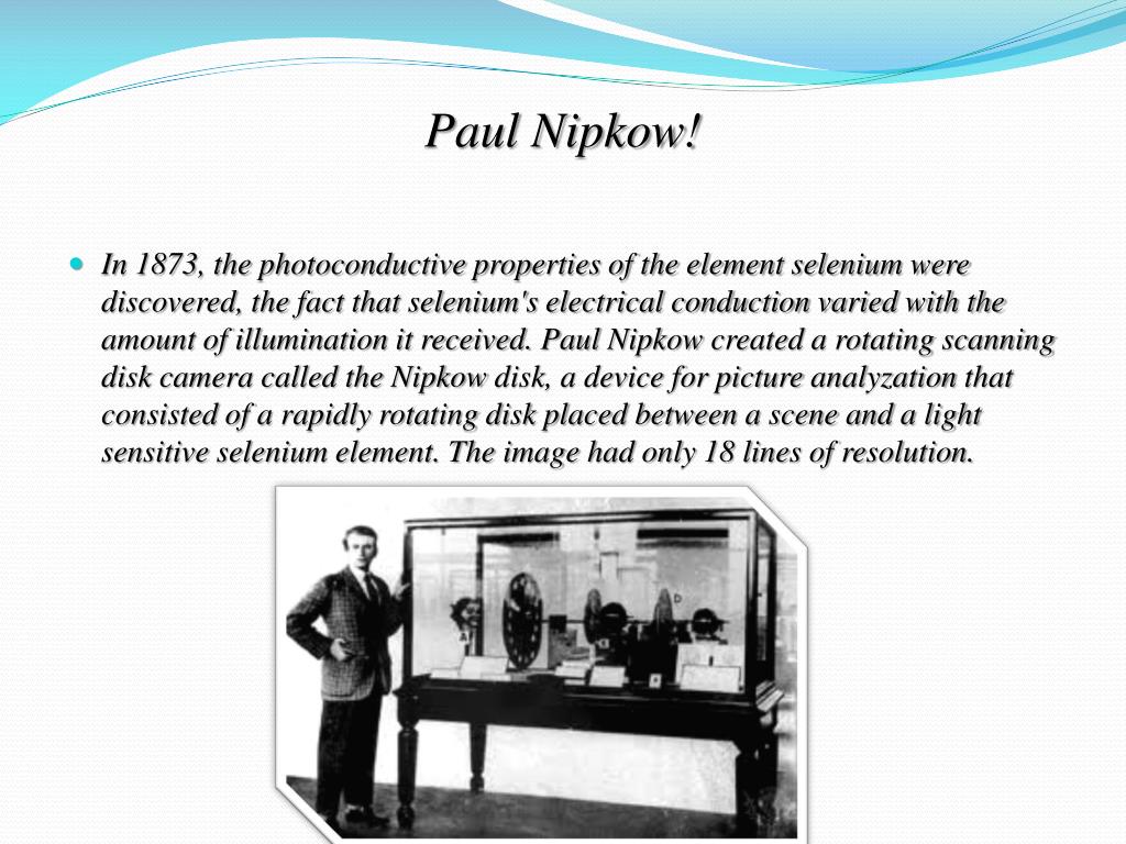 Paul Nipkow! • In 1873, the photoconductive properties of the element selenium were discovered, the fact that selenium's electrical conduction varied with the amount of illumination it received. Paul Nipkow created a rotating scanning disk camera called the Nipkow disk, a device for picture analyzation that consisted of a rapidly rotating disk placed between a scene and a light sensitive selenium element. The image had only 18 lines of resolution.