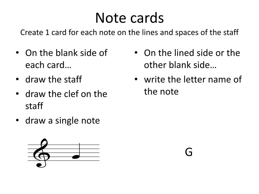 Note cardsCreate 1 card for each note on the lines and spaces of the staff • On the blank side of each card… • draw the staff • draw the clef on the staff • draw a single note • On the lined side or the other blank side… • write the letter name of the note G