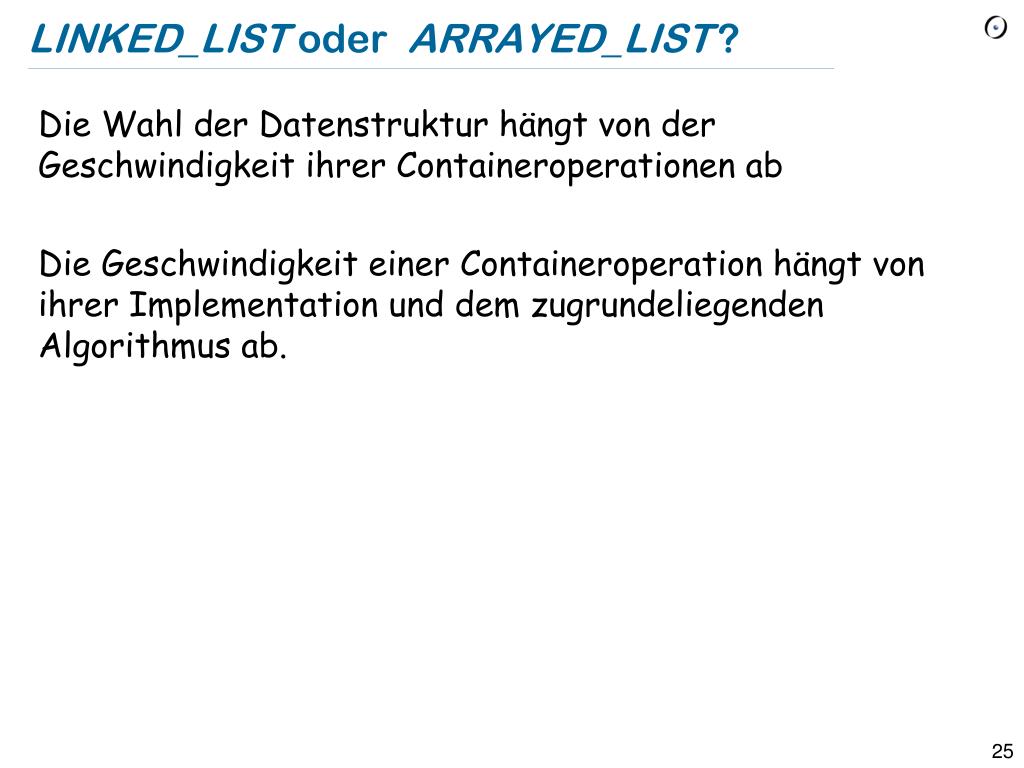 LINKED_LIST oder ARRAYED_LIST? • Die Wahl der Datenstruktur hängt von der Geschwindigkeit ihrer Containeroperationen ab • Die Geschwindigkeit einer Containeroperation hängt von ihrer Implementation und dem zugrundeliegenden Algorithmus ab.