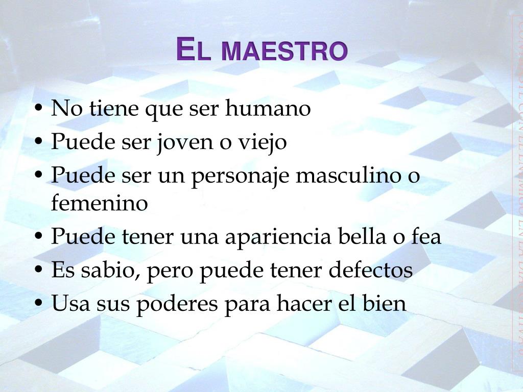 El enemigo • Tiene la misma apariencia que el maestro • Puede ser joven o viejo • Puede ser un personaje masculino o femenino • Puede tener una apariencia bella o fea • Es sabio, pero lleno de defectos • Usa sus poderes para hacer el mal