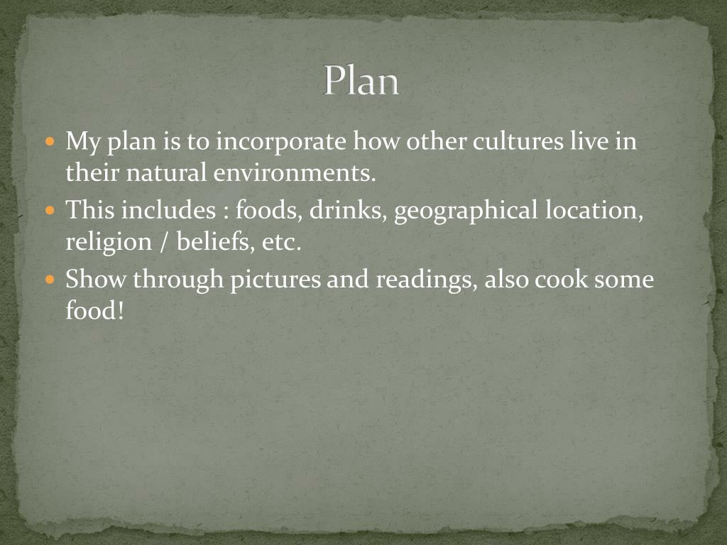 Plan • My plan is to incorporate how other cultures live in their natural environments. • This includes : foods, drinks, geographical location, religion / beliefs, etc. • Show through pictures and readings, also cook some food!