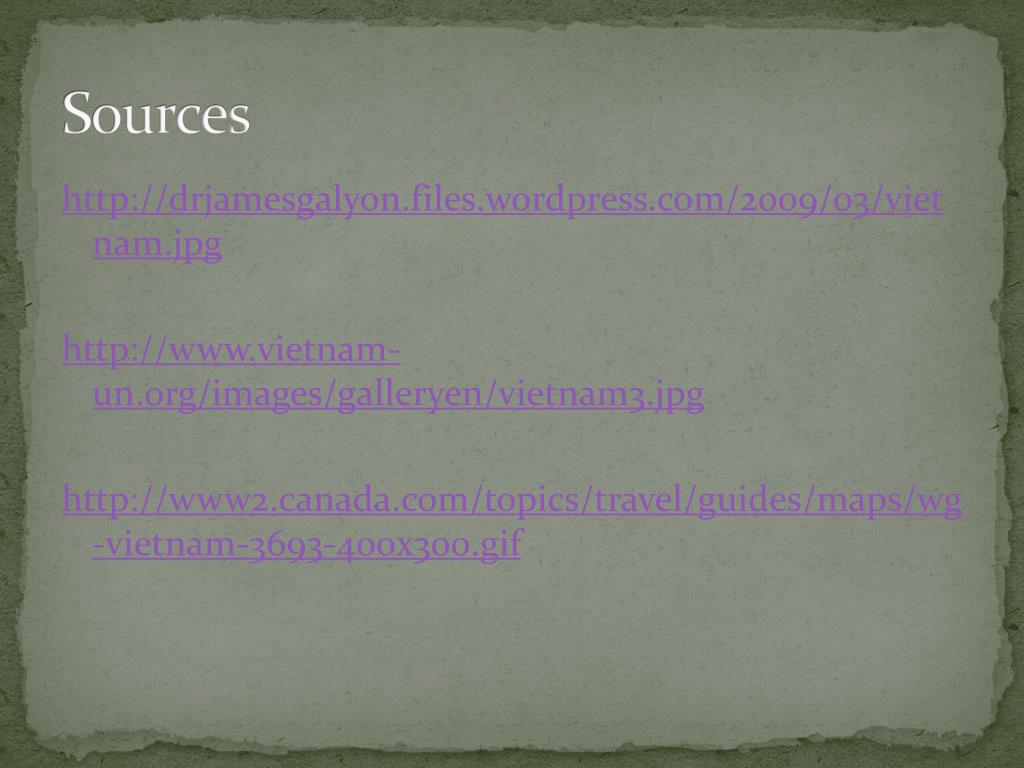 Sources http://drjamesgalyon.files.wordpress.com/2009/03/vietnam.jpg http://www.vietnam-un.org/images/galleryen/vietnam3.jpg http://www2.canada.com/topics/travel/guides/maps/wg-vietnam-3693-400x300.gif