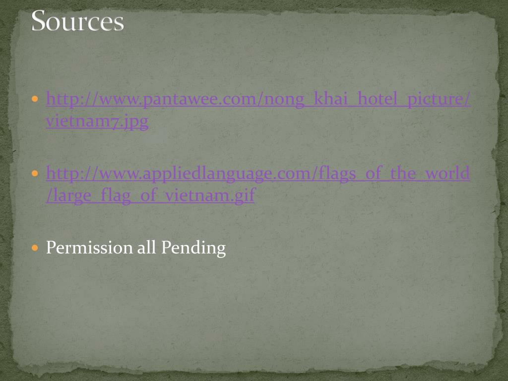 Sources • http://www.pantawee.com/nong_khai_hotel_picture/vietnam7.jpg • http://www.appliedlanguage.com/flags_of_the_world/large_flag_of_vietnam.gif • Permission all Pending