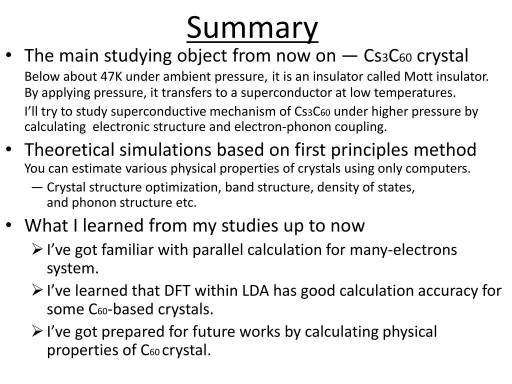 Summary • The main studying objectfrom now on ― Cs3C60 crystalBelow about 47K under ambient pressure,it is an insulator called Mott insulator. By applying pressure, it transfers to a superconductor at low temperatures. I’ll try to study superconductive mechanism of Cs3C60 under higher pressure by calculating electronic structure and electron-phonon coupling. • Theoretical simulations based on first principles methodYou can estimate various physical properties of crystals using only computers. ―Crystal structure optimization, band structure, density of states, and phonon structure etc. • What I learned from my studies up to now • I’ve got familiar with parallel calculation for many-electrons system. • I’ve learned that DFT within LDA has good calculation accuracy for some C60-based crystals. • I’ve got prepared for future works by calculating physical properties of C60 crystal.