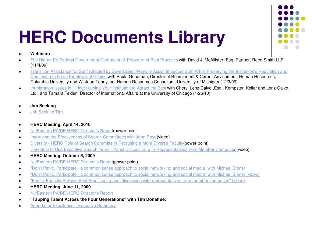 HERC Documents Library • Webinars • The Higher Ed Federal Government Contractor: A Potpourri of Best Practices with David J. McAllister, Esq. Partner, Reed Smith LLP (11/4/09) • Transition Assistance for Staff Affected by Downsizing: Ways to Assist Impacted Staff While Preserving the Institution's Reputation and Continuing to be an Employer of Choice with Paula Goodman, Director of Recruitment & Career Advisement, Human Resources, Columbia University and W. Jean Tennyson, Human Resources Consultant, University of Michigan (12/3/09) • Immigration Issues in Hiring: Helping Your Institution to Attract the Best with Cheryl Lenz-Calvo ,Esq., Kempster, Keller and Lenz-Calvo, Ltd., and Tamara Felden, Director of International Affairs at the University of Chicago (1/26/10) • Job Seeking • Job Seeking Tips • HERC Meeting, April 14, 2010 • NJ/Eastern PA/DE HERC Director’s Report(power point • Improving the Efectiveness of Search Committees with John Rose(video) • Diversity - HERC Role of Search Committe in Recruiting a More Diverse Faculty(power point) • How Best to Use Executive Search Firms - Panel Discussion with Representatives from Member Campuses(video) • HERC Meeting, October 6, 2009 • NJ/Eastern PA/DE HERC Director's Report(power point) • "Don't Panic, Participate - a common sense approach to social networking and social media" with Michael Stoner • "Don't Panic, Participate - a common sense approach to social networking and social media" with Michael Stoner (video) • "Family Friendly Policies Best Practices - panel discussion with representatives from member campuses" (video) • HERC Meeting, June 11, 2009 • NJ/Eastern PA/DE HERC Director's Report • "Tapping Talent Across the Four Generations" with Tim Donahue: • Agenda for Excellence - Executive Summary