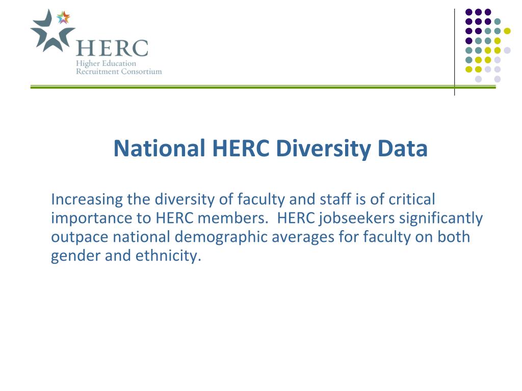 National HERC Diversity Data Increasing the diversity of faculty and staff is of critical importance to HERC members. HERC jobseekers significantly outpace national demographic averages for faculty on both gender and ethnicity.