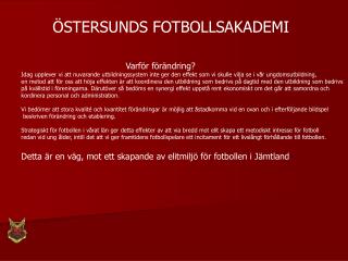 ÖSTERSUNDS FOTBOLLSAKADEMI. Varför förändring? Idag upplever vi att nuvarande utbildningssystem inte ger den effekt som vi skulle vilja se i vår ungdomsutbildning, en metod att för oss att höja effekten är att koordinera den utbildning som bedrivs på dagtid med den utbildning som bedrivs