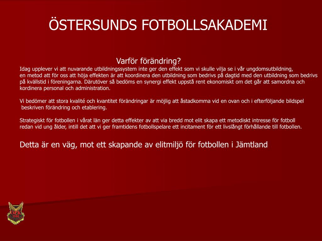 ÖSTERSUNDS FOTBOLLSAKADEMI Varför förändring? Idag upplever vi att nuvarande utbildningssystem inte ger den effekt som vi skulle vilja se i vår ungdomsutbildning, en metod att för oss att höja effekten är att koordinera den utbildning som bedrivs på dagtid med den utbildning som bedrivs på kvällstid i föreningarna. Därutöver så bedöms en synergi effekt uppstå rent ekonomiskt om det går att samordna och kordinera personal och administration. Vi bedömer att stora kvalité och kvantitet förändringar är möjlig att åstadkomma vid en ovan och i efterföljande bildspel beskriven förändring och etablering. Strategiskt för fotbollen i vårat län ger detta effekter av att via bredd mot elit skapa ett metodiskt intresse för fotboll redan vid ung ålder, intill det att vi ger framtidens fotbollspelare ett incitament för ett livslångt förhållande till fotbollen. Detta är en väg, mot ett skapande av elitmiljö för fotbollen i Jämtland