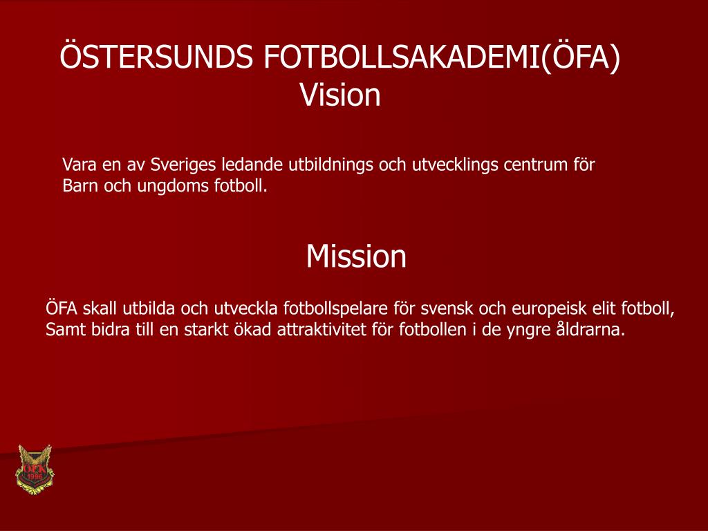ÖSTERSUNDS FOTBOLLSAKADEMI(ÖFA) Vision Vara en av Sveriges ledande utbildnings och utvecklings centrum för Barn och ungdoms fotboll. Mission ÖFA skall utbilda och utveckla fotbollspelare för svensk och europeisk elit fotboll, Samt bidra till en starkt ökad attraktivitet för fotbollen i de yngre åldrarna.