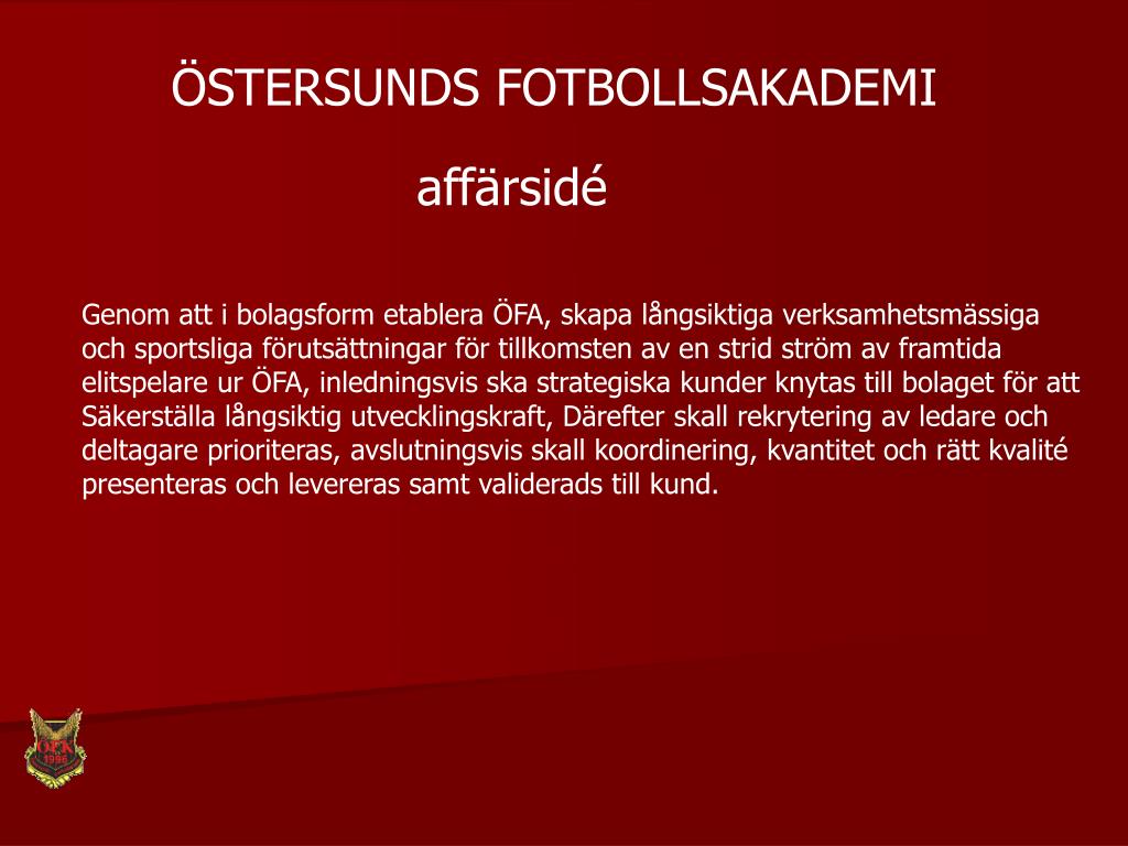 ÖSTERSUNDS FOTBOLLSAKADEMI affärsidé Genom att i bolagsform etablera ÖFA, skapa långsiktiga verksamhetsmässiga och sportsliga förutsättningar för tillkomsten av en strid ström av framtida elitspelare ur ÖFA, inledningsvis ska strategiska kunder knytas till bolaget för att Säkerställa långsiktig utvecklingskraft, Därefter skall rekrytering av ledare och deltagare prioriteras, avslutningsvis skall koordinering, kvantitet och rätt kvalité presenteras och levereras samt validerads till kund.