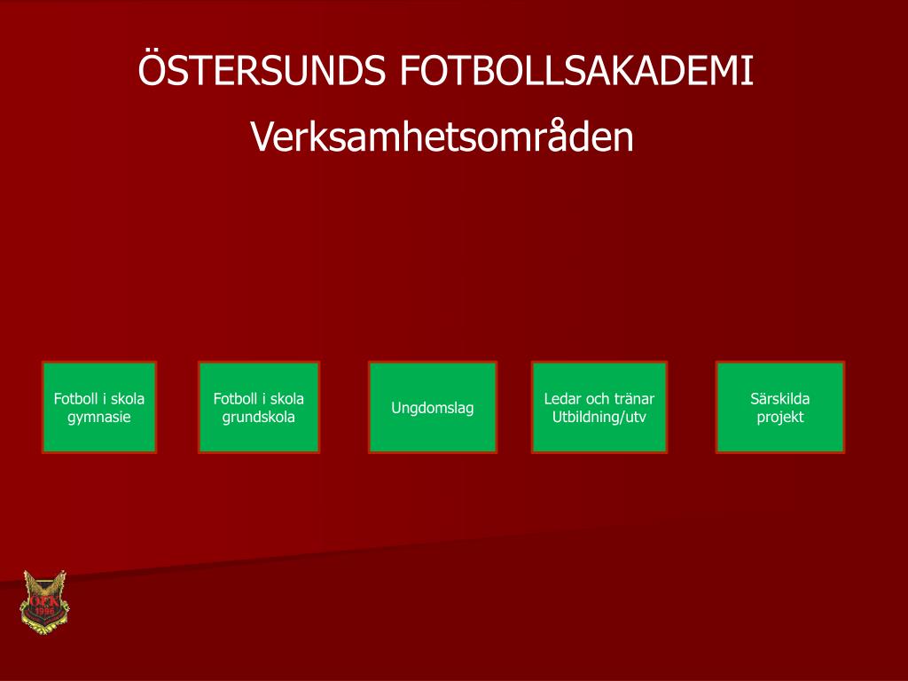 ÖSTERSUNDS FOTBOLLSAKADEMI Verksamhetsområden Fotboll i skola gymnasie Fotboll i skola grundskola Ungdomslag Ledar och tränar Utbildning/utv Särskilda projekt