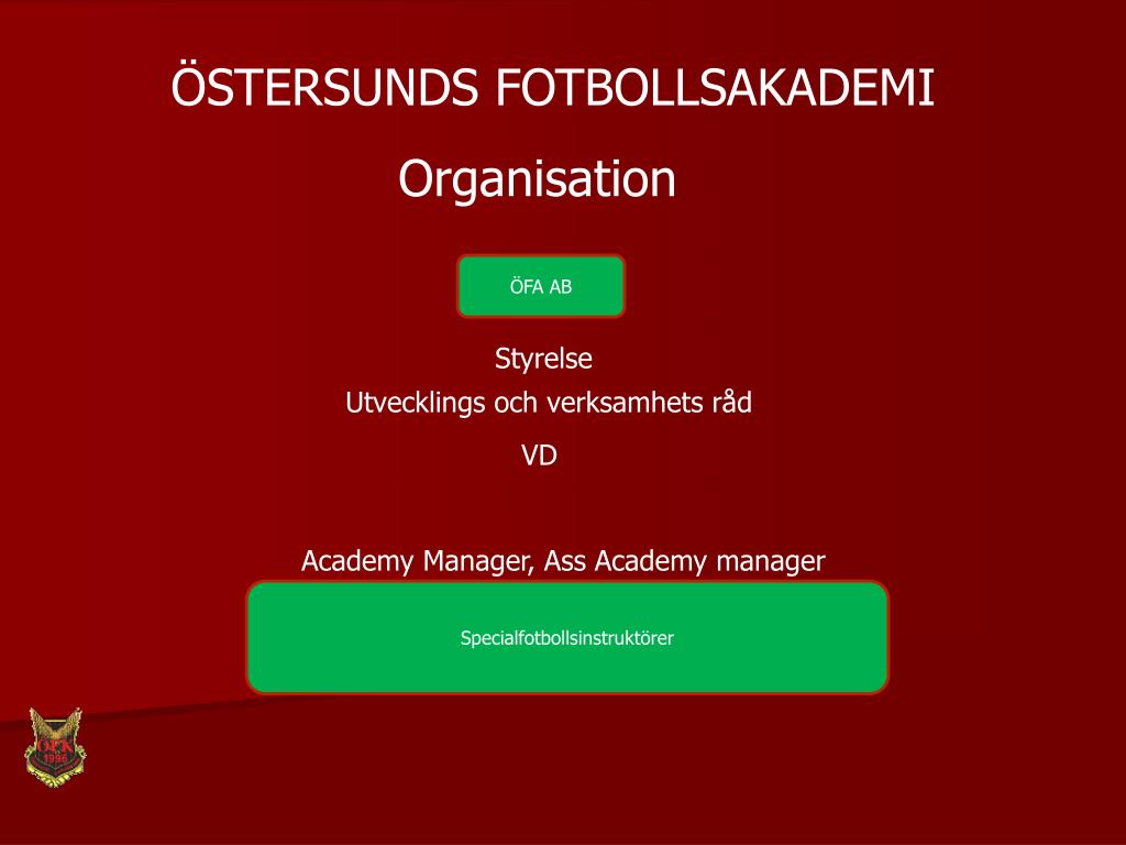 ÖSTERSUNDS FOTBOLLSAKADEMI Organisation ÖFA AB Styrelse Utvecklings och verksamhets råd VD Academy Manager, Ass Academy manager Specialfotbollsinstruktörer