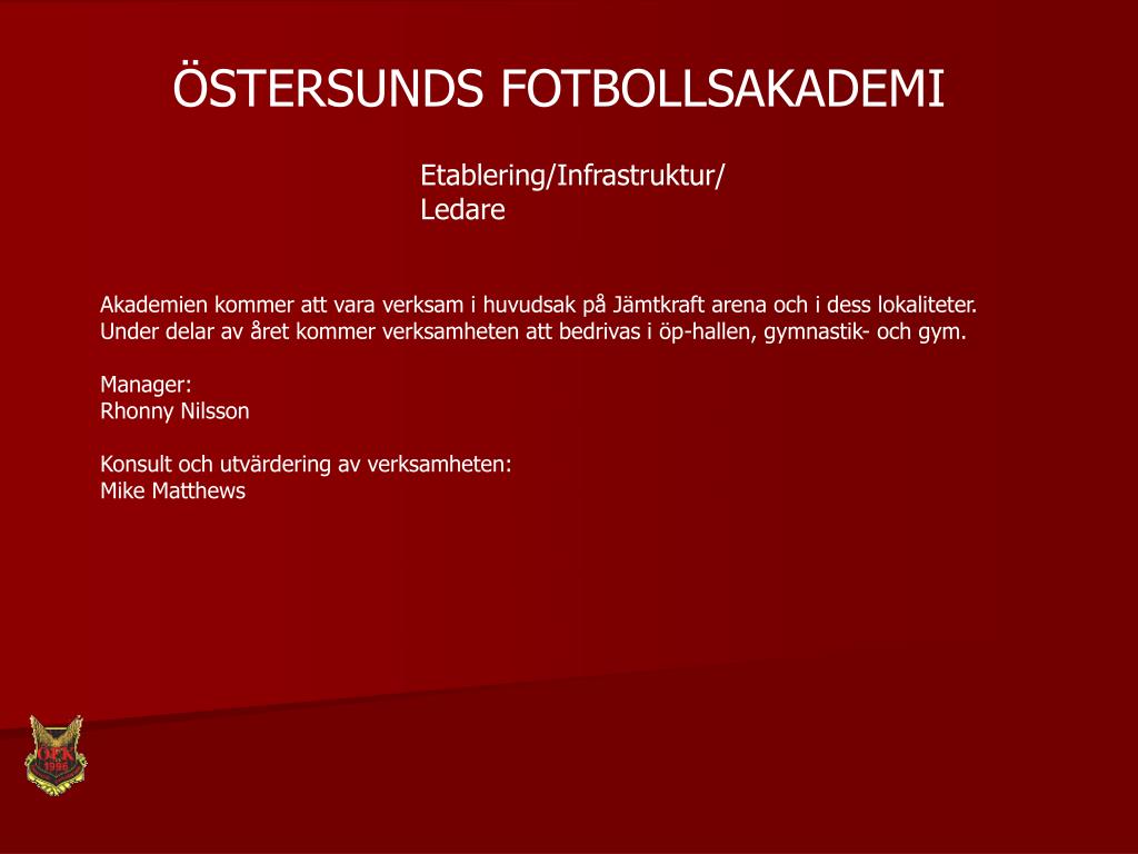 ÖSTERSUNDS FOTBOLLSAKADEMI Etablering/Infrastruktur/ Ledare Akademien kommer att vara verksam i huvudsak på Jämtkraft arena och i dess lokaliteter. Under delar av året kommer verksamheten att bedrivas i öp-hallen, gymnastik- och gym. Manager: Rhonny Nilsson Konsult och utvärdering av verksamheten: Mike Matthews