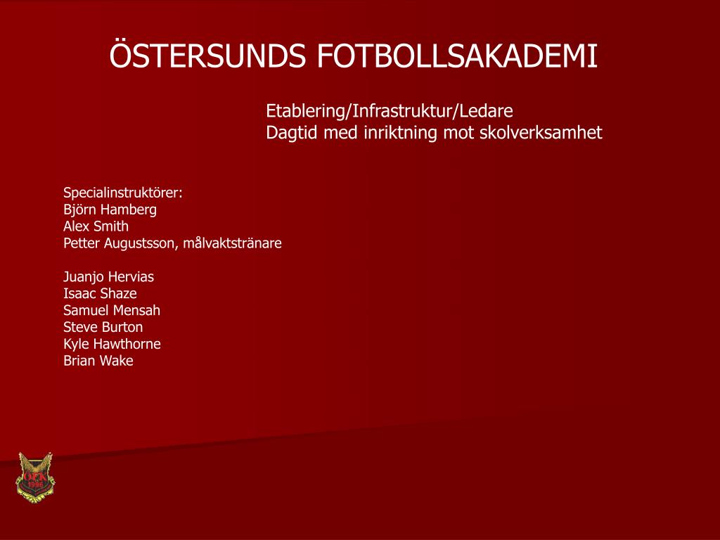 ÖSTERSUNDS FOTBOLLSAKADEMI Etablering/Infrastruktur/Ledare Dagtid med inriktning mot skolverksamhet Specialinstruktörer: Björn Hamberg Alex Smith Petter Augustsson, målvaktstränare Juanjo Hervias Isaac Shaze Samuel Mensah Steve Burton Kyle Hawthorne Brian Wake