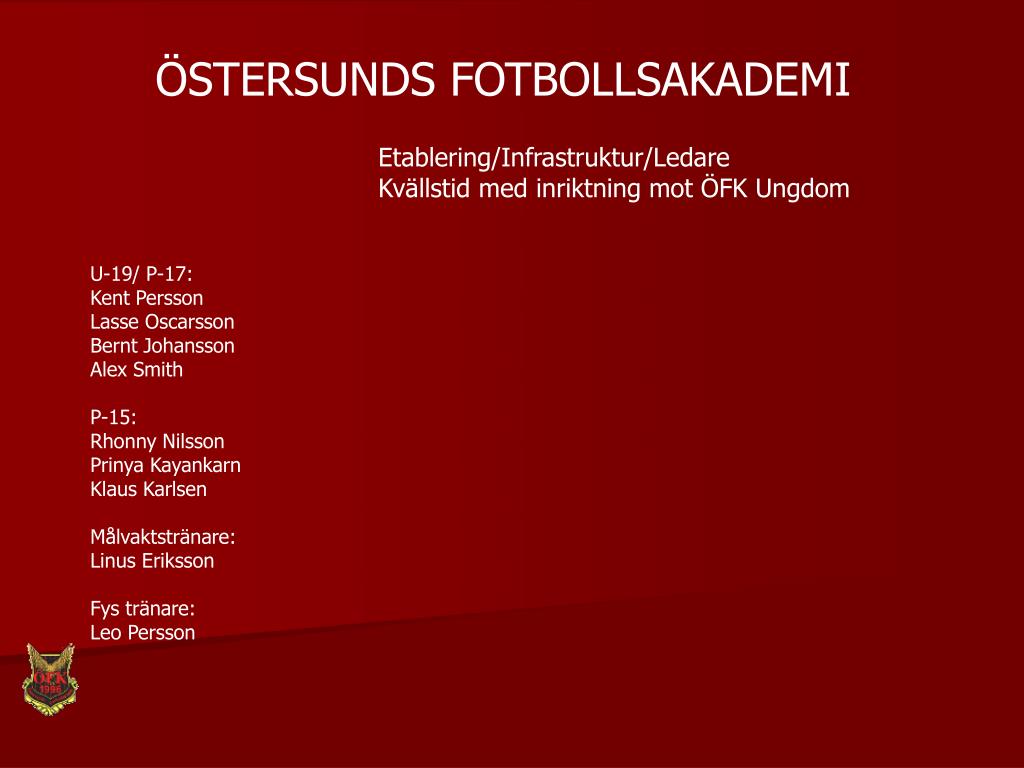 ÖSTERSUNDS FOTBOLLSAKADEMI Etablering/Infrastruktur/Ledare Kvällstid med inriktning mot ÖFK Ungdom U-19/ P-17: Kent Persson Lasse Oscarsson Bernt Johansson Alex Smith P-15: Rhonny Nilsson Prinya Kayankarn Klaus Karlsen Målvaktstränare: Linus Eriksson Fys tränare: Leo Persson