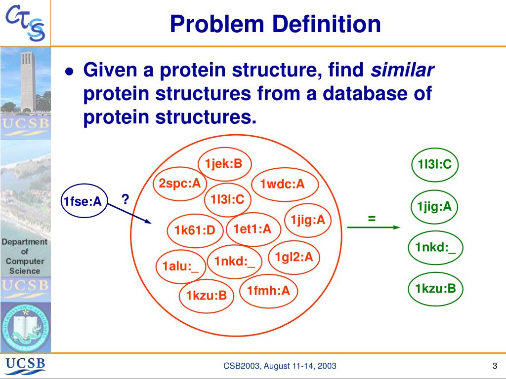 1l3l:C 2spc:A 1jig:A 1fse:A 1jig:A 1jek:B 1alu:_ 1l3l:C 1kzu:B 1k61:D 1wdc:A 1nkd:_ 1fmh:A 1gl2:A 1et1:A 1nkd:_ 1kzu:B Problem Definition • Given a protein structure, find similar protein structures from a database of protein structures. ? =